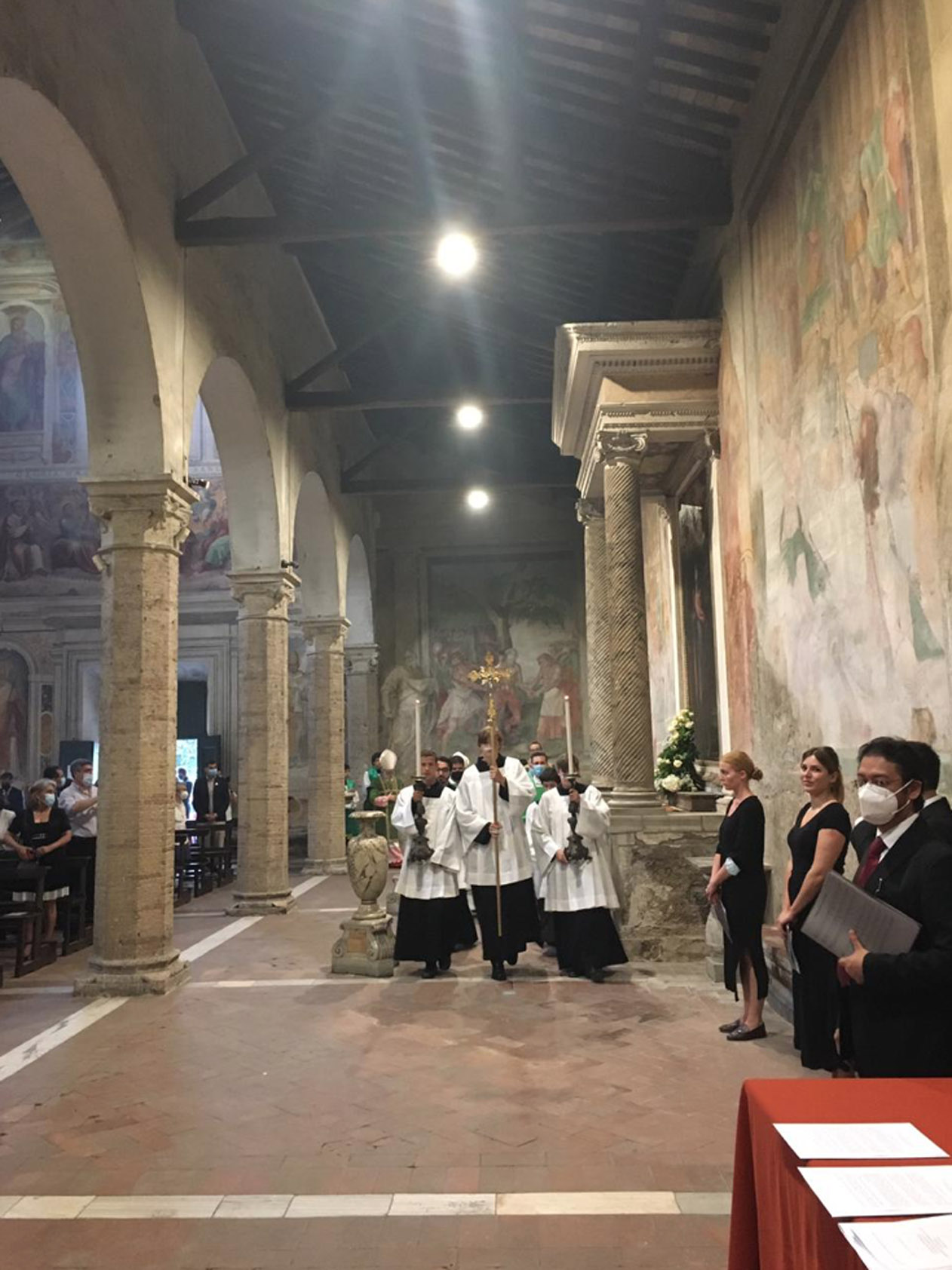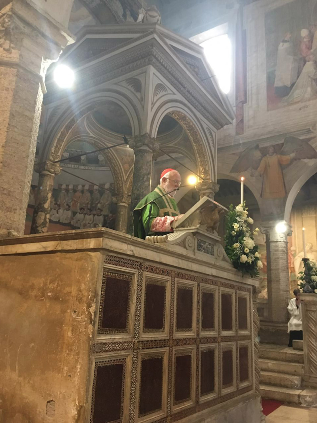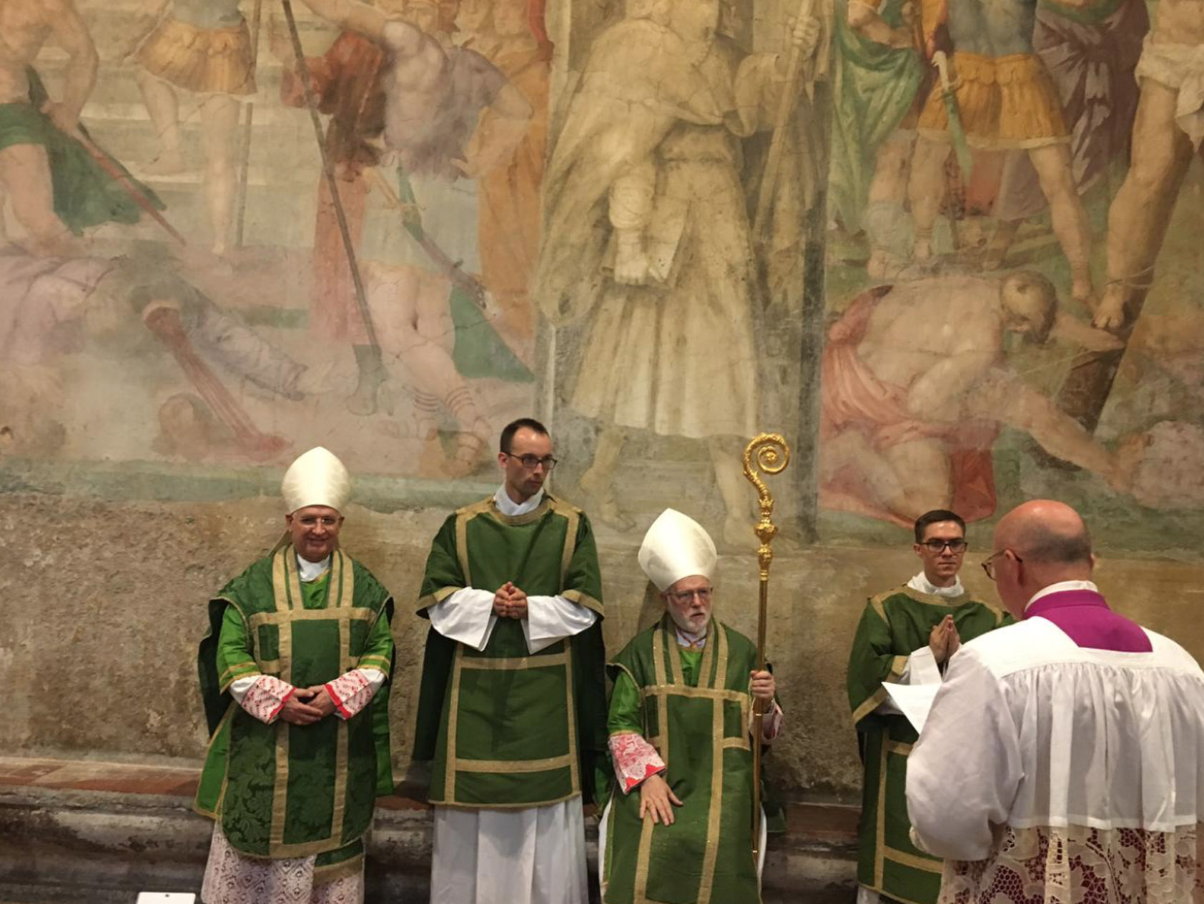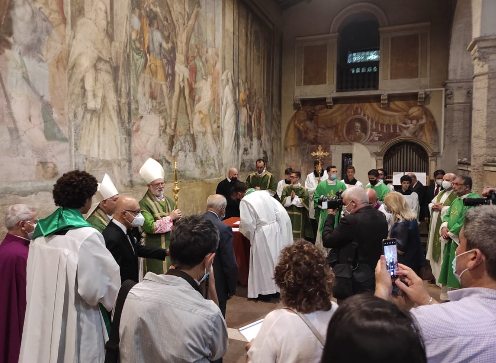 Entre as paredes amplamente afrescadas com as cenas cruéis de muitos martírios, ressoou o convite evangélico a não se ter medo, também quando as tempestades agitam a barca em que estamos. Não se deixar abandonar ao medo, mas “amar e servir”, como indica o lema escolhido pelo Cardeal para o seu brasão, agora posto na fachada da Igreja.