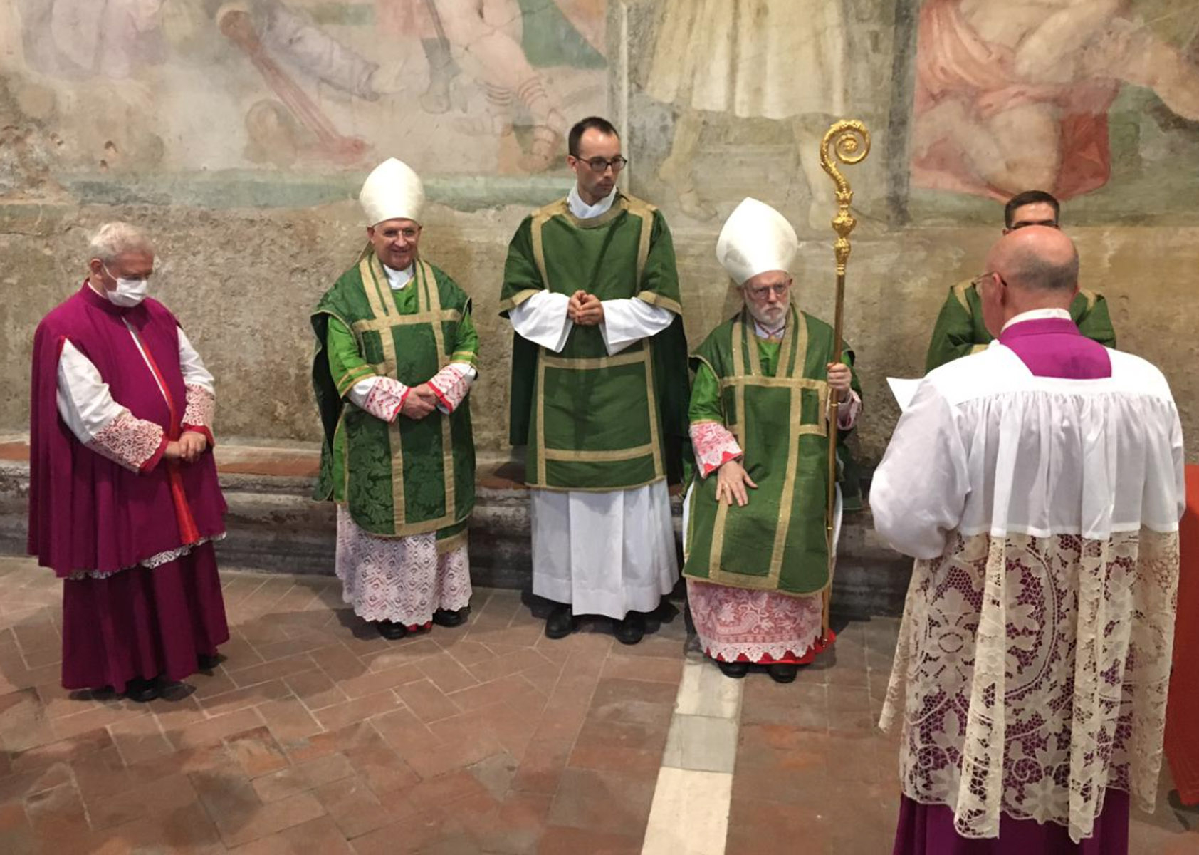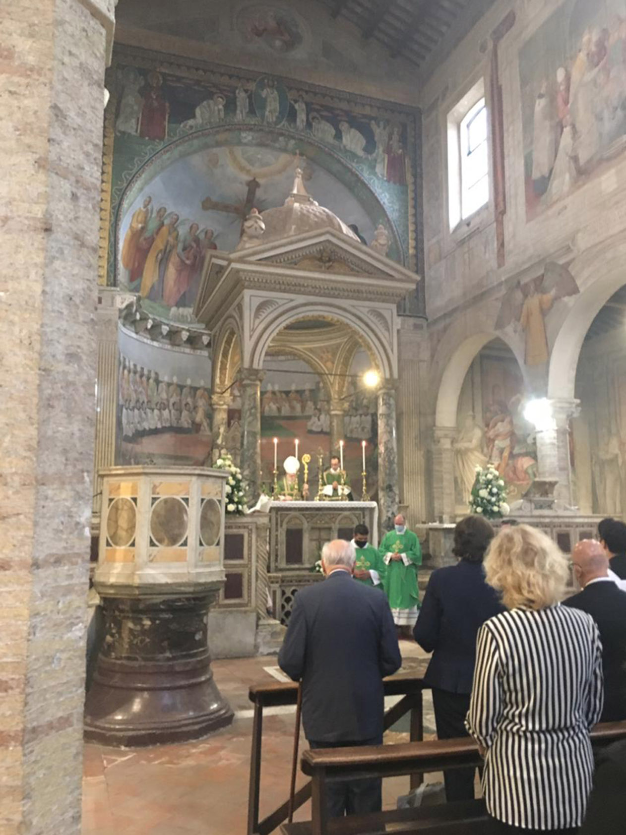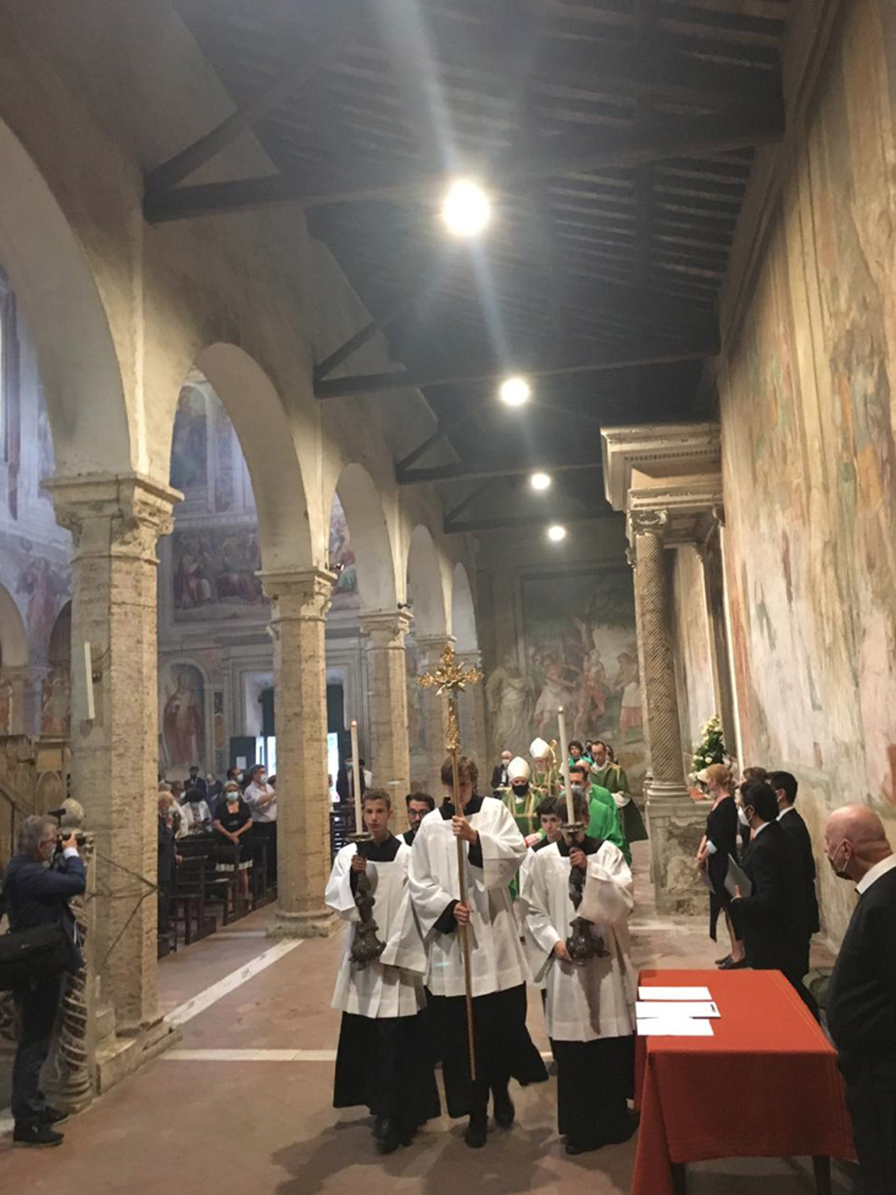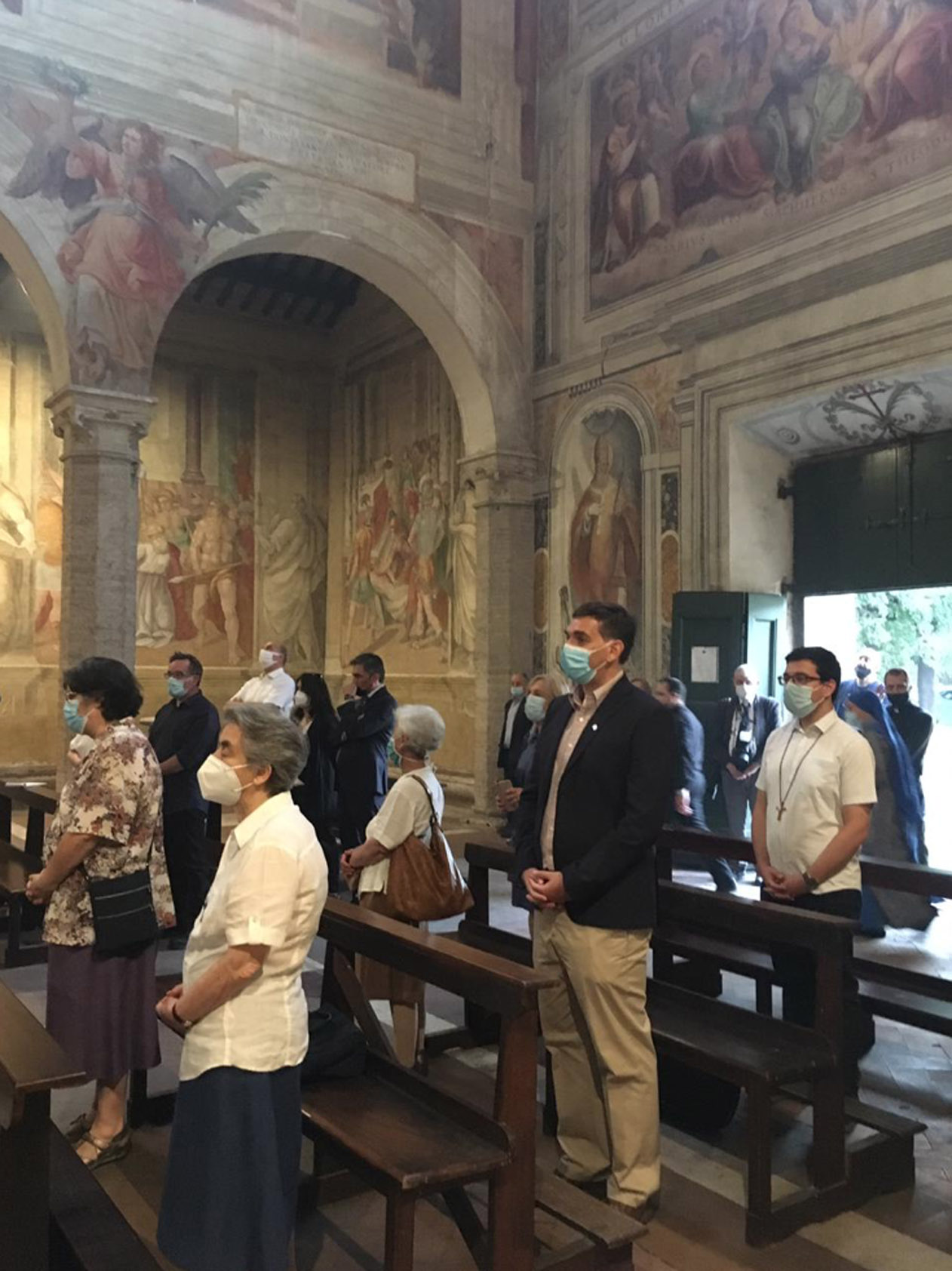 Entre as paredes amplamente afrescadas com as cenas cruéis de muitos martírios, ressoou o convite evangélico a não se ter medo, também quando as tempestades agitam a barca em que estamos. Não se deixar abandonar ao medo, mas “amar e servir”, como indica o lema escolhido pelo Cardeal para o seu brasão, agora posto na fachada da Igreja.