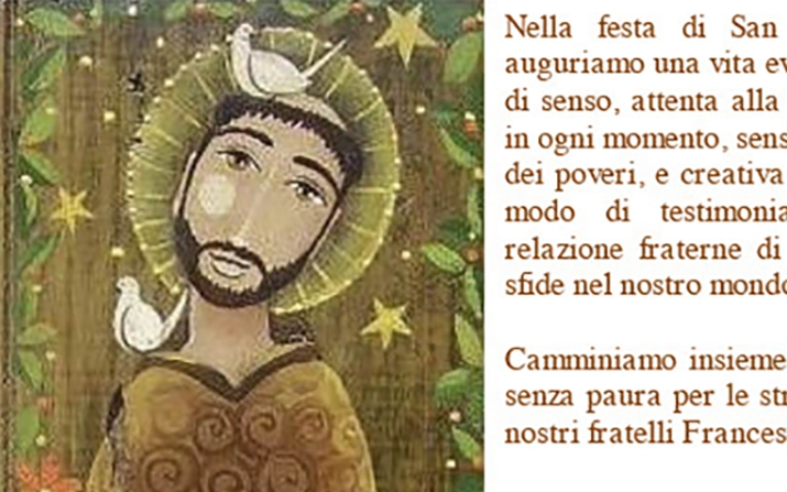 Nella festa di San Francesco vi auguriamo una vita evangelica piena di senso, attenta alla volontà di Dio in ogni momento, sensibile ai bisogni dei poveri, e creativa e concreta nel modo di testimoniare le nostre relazione fraterne di fronte a tante sfide nel nostro mondo attuale.
