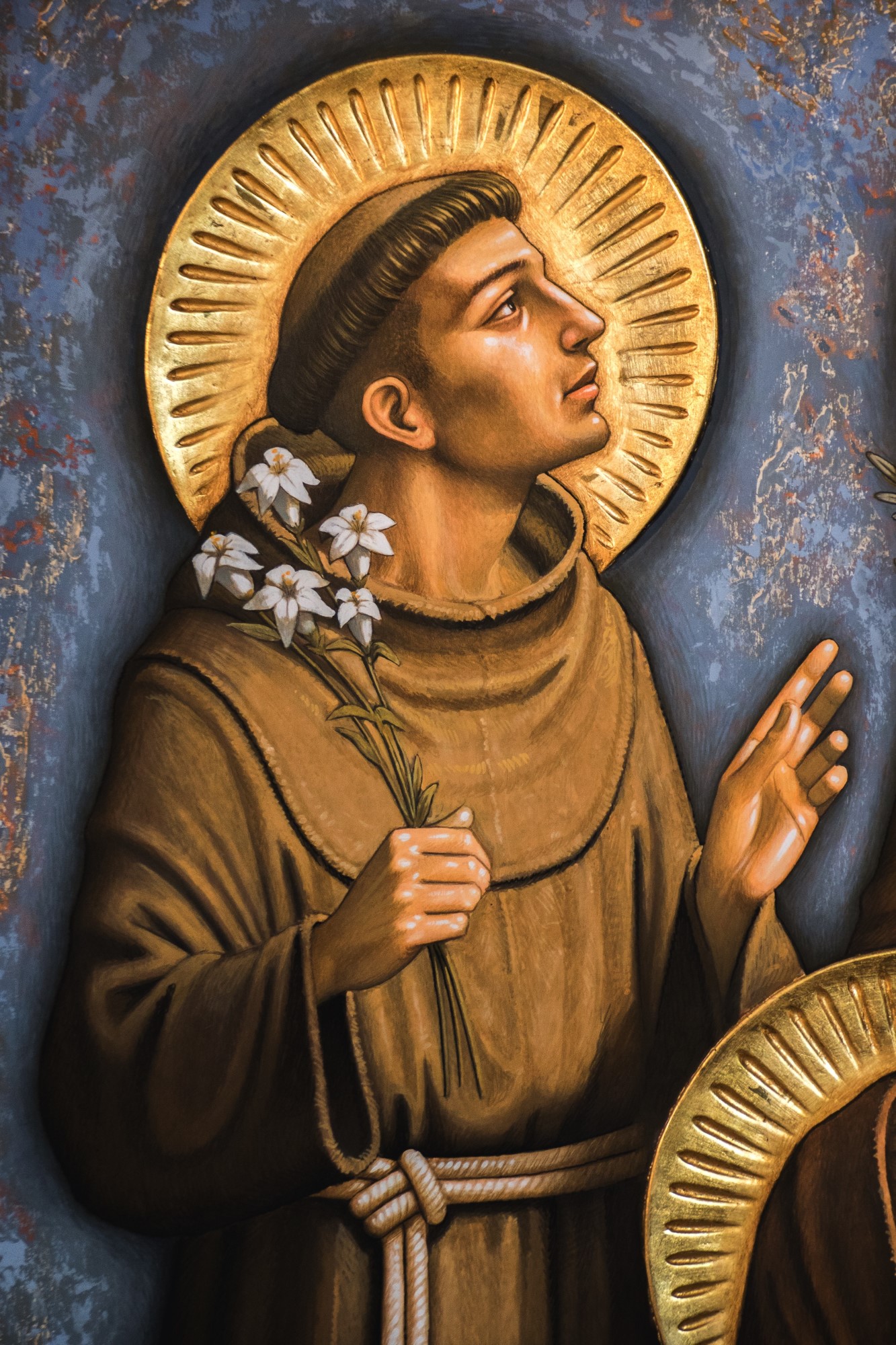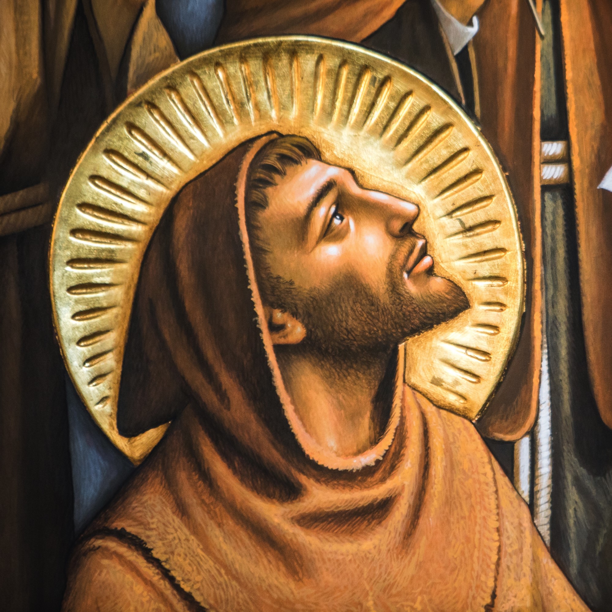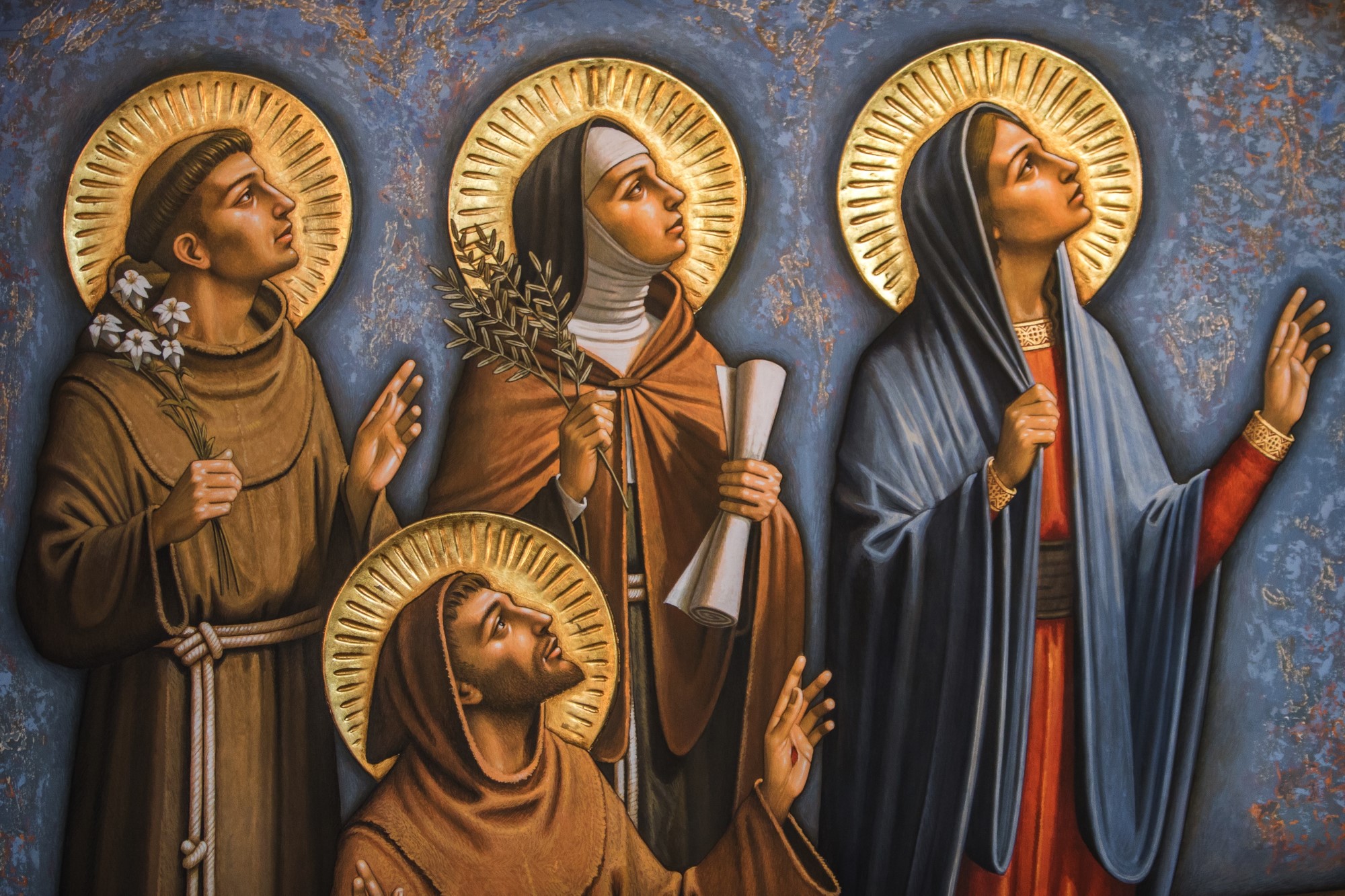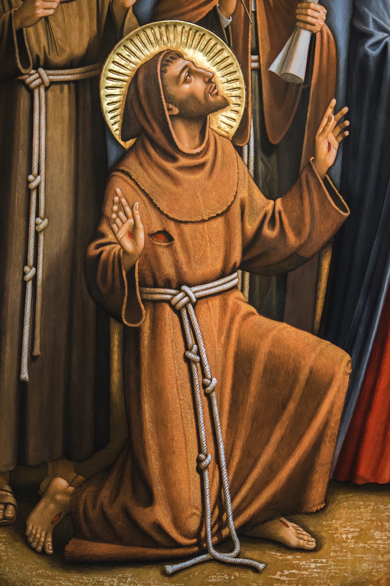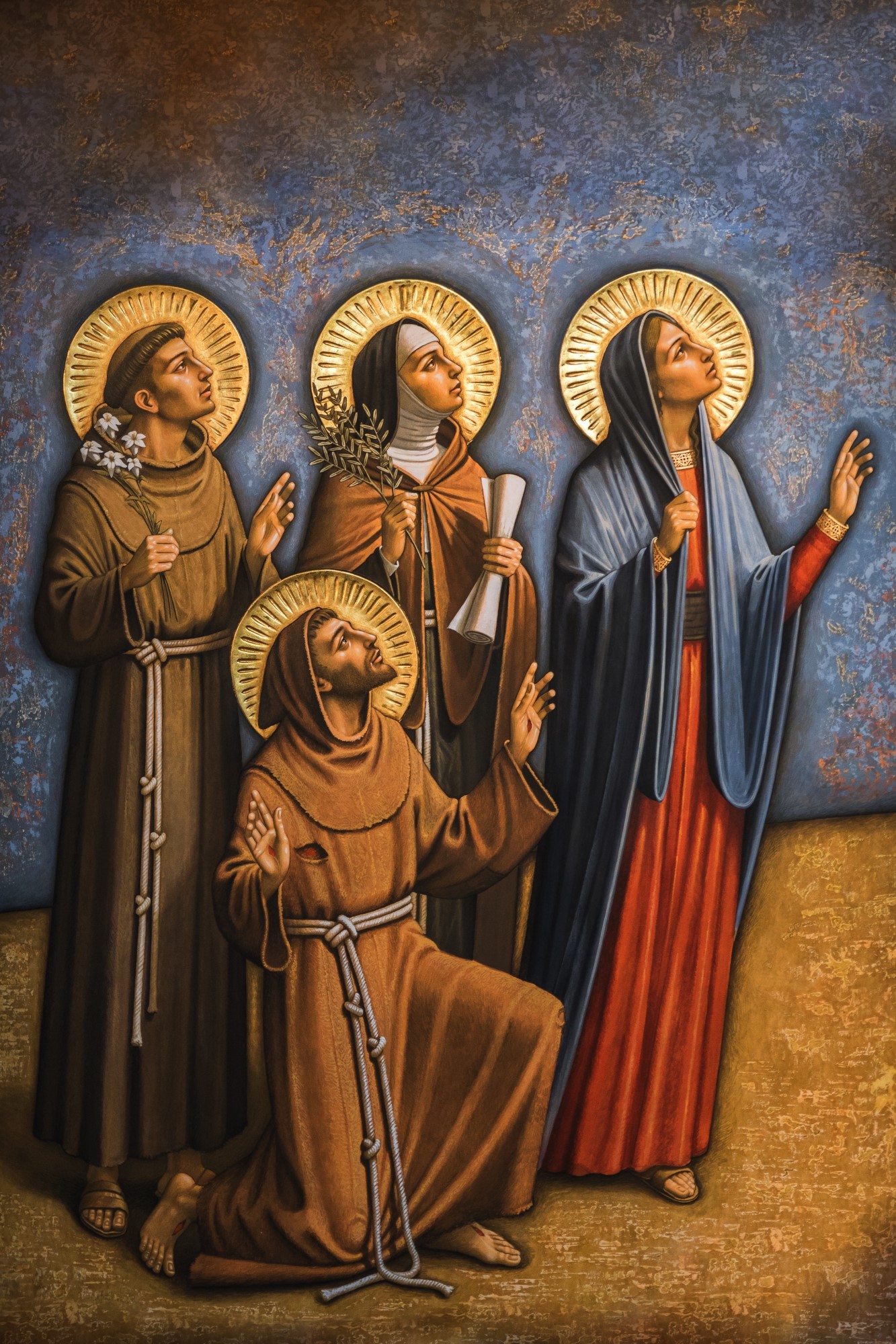 Die Fotos geben das Gemälde von Piero Casentini wieder: Maria mit den Heiligen Antonius, Klara, Franziskus und den fünf Erstlingsmärtyrern in Anbetung des Gekreuzigten (aus dem Jahr 2012); es befindet sich im Klarissenkloster der hl. Verkündigung in Terni (Italien).