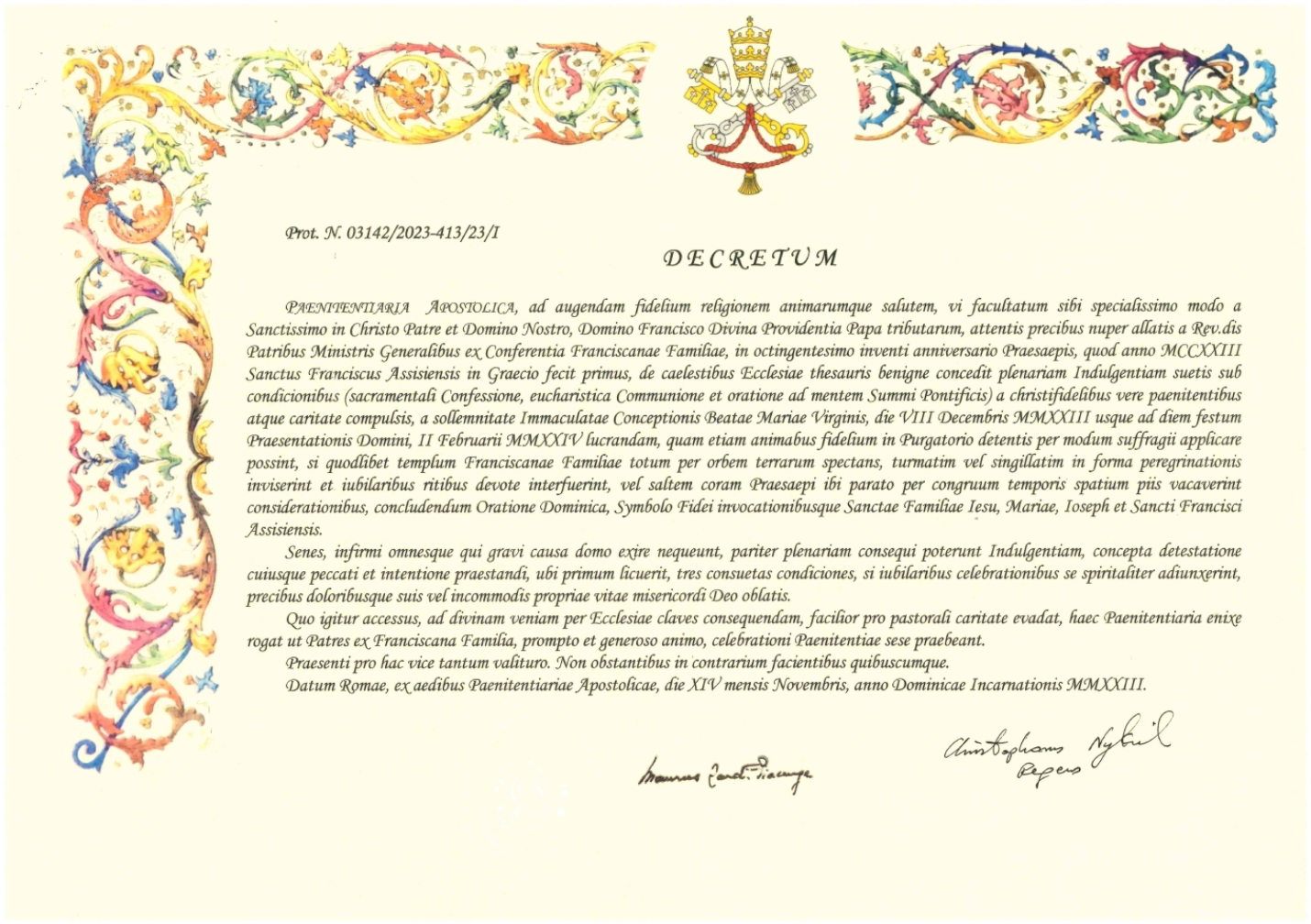 Alcune settimane fa è stato annunciato a tutti voi il dono grande che il Santo Padre ha voluto concederci in occasione degli 800 anni del Natale di Greccio attraverso il dono dell’Indulgenza. Ci eravamo premurati di trasmetterla subito, affinché ciascuna realtà potesse prenderla in considerazione e trovare il modo migliore per valorizzarla per noi e per i fedeli che frequentano le nostre chiese.