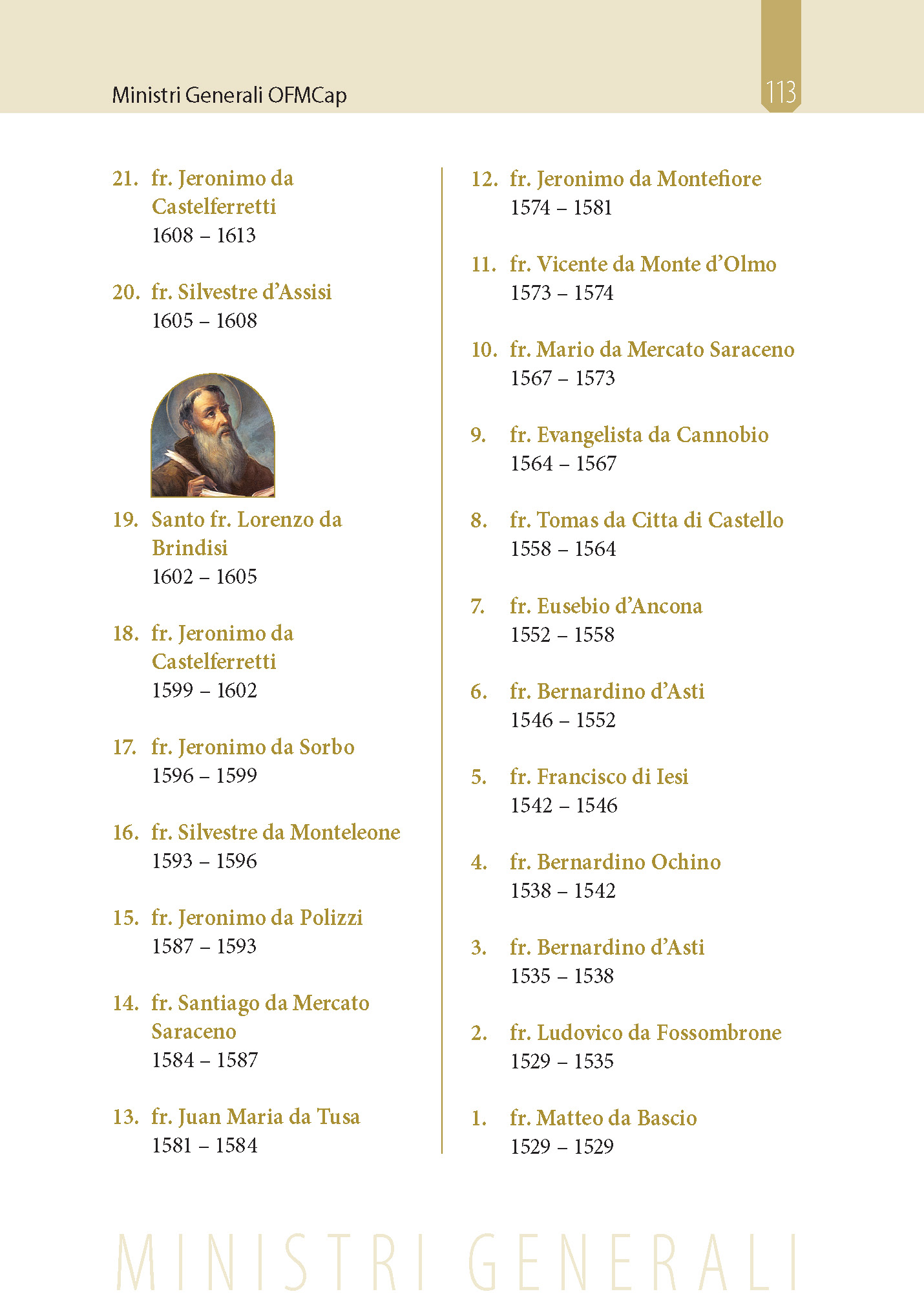 Fünfter Teil: Einige besondere Informationen über den Orden: Statistiken, Liste der Konferenzen, die Namen der Generalminister seit Gründung des Ordens und schliesslich die Liste der Brüder, deren Heiligkeit von der Kirche offiziell festgestellt wurde.