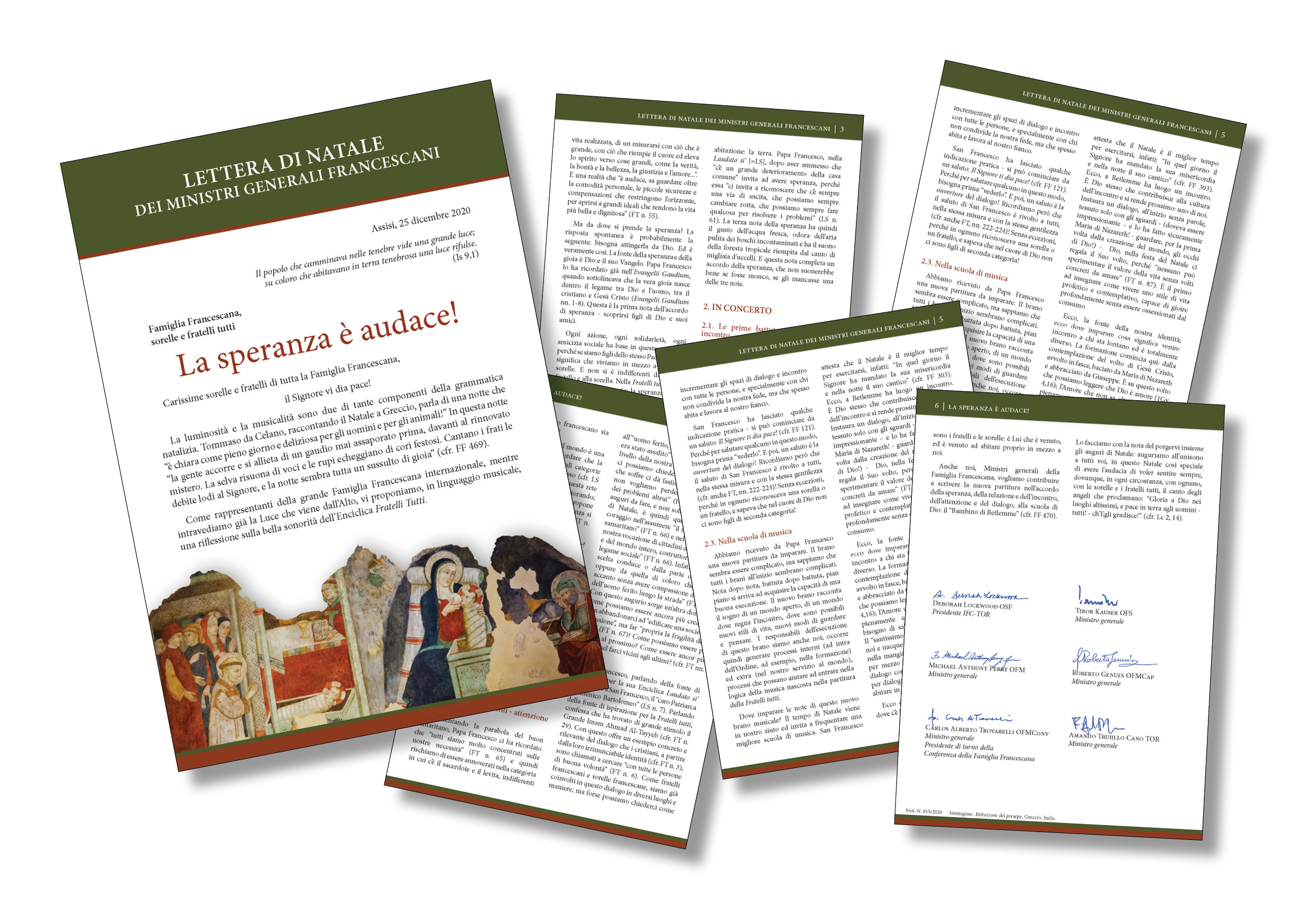 Anche noi, Ministri generali della Famiglia Francescana, vogliamo contribuire a scrivere la nuova partitura nell’accordo della speranza, della relazione e dell’incontro, dell’attenzione e del dialogo, alla scuola di Dio: il “Bambino di Betlemme” (cfr. FF 470). Lo facciamo con la nota del porgervi insieme gli auguri di Natale: auguriamo all’unisono a tutti voi, in questo Natale così speciale di avere l’audacia di voler sentire sempre, dovunque, in ogni circostanza, con ognuno, con le sorelle e i fratelli tutti, il canto degli angeli che proclamano: “Gloria a Dio nei luoghi altissimi, e pace in terra agli uomini – tutti! – ch’Egli gradisce!” (cfr. Lc 2, 14).