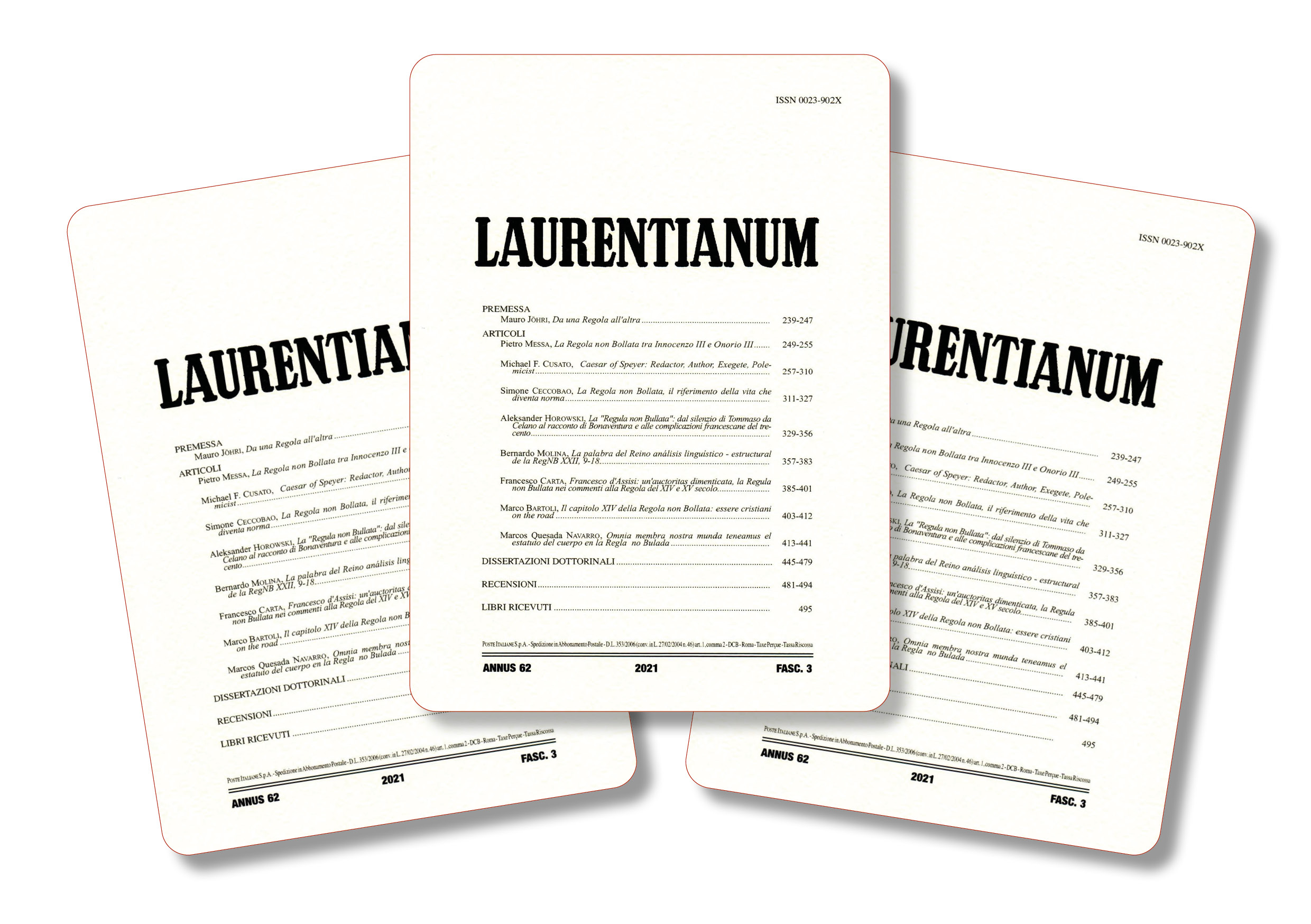 Il presente fascicolo della rivista Laurentianum è dedicato quasi esclusivamente alla commemorazione dell’ottavo centenario della Regola non Bollata (1221-2021). Consiste di otto contributi scientifici, preceduti da una prefazione scritta da fr. Mauro Jöhri OFMCap. Gli articoli si occupano di vari aspetti della Regola non Bollata, fra i quali: la storia del testo, analisi dello stile, e la sua rilevanza per l’attualità. Il progetto di consacrare il fascicolo a questo tema si è felicemente concretizzato grazie alla generosa collaborazione degli autori, oltre al doveroso impegno di tutta l’equipe che gestisce la rivista.