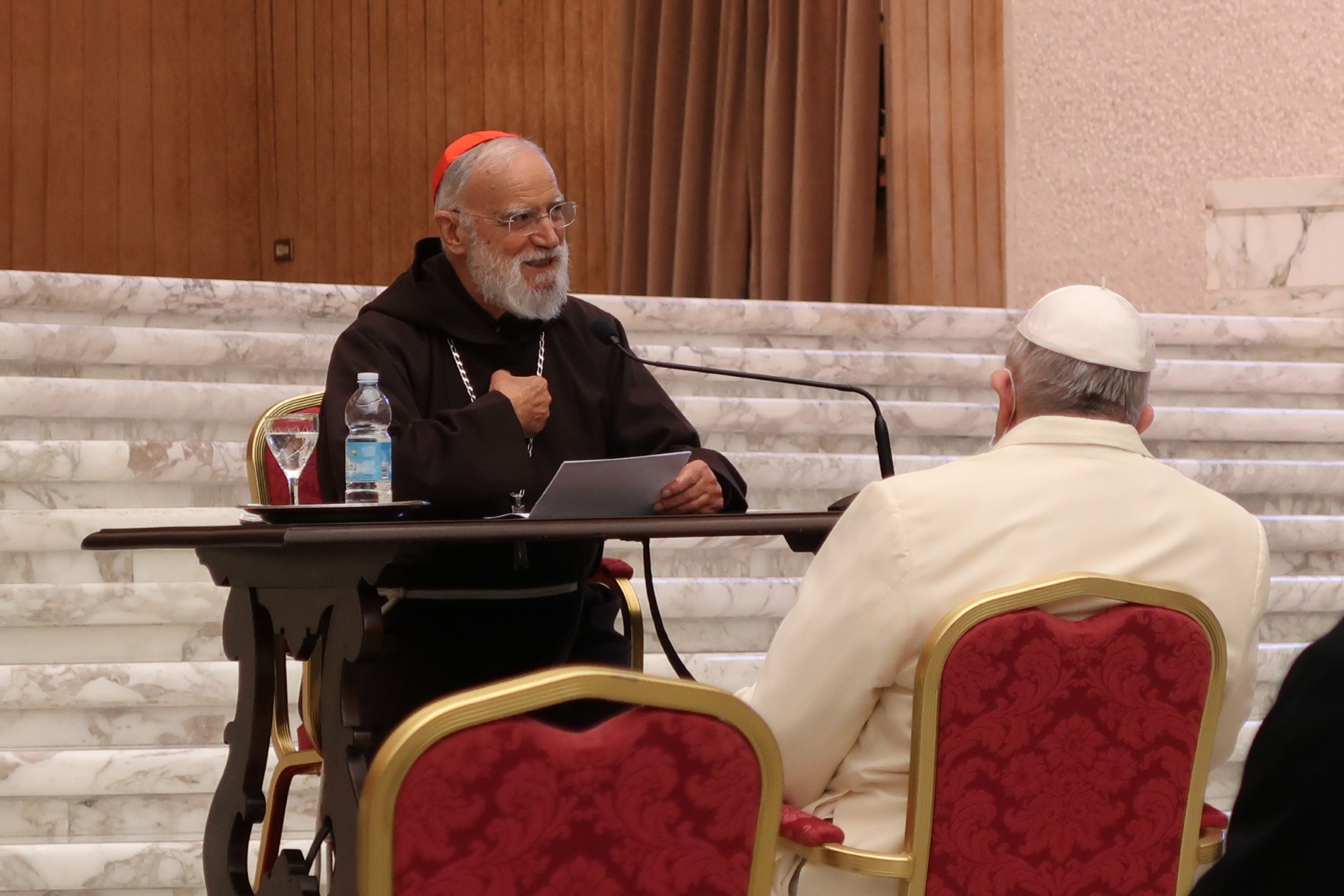 Die Meditationen wurden in diesem Advent nicht wie gewöhnlich in der Kapelle Redemptoris Mater abgehalten, sondern wegen der von Corona gebotenen Distanz in der Aula Paul VI. Dieser Ortswechsel machte es möglich, dass neben dem Papst und den Kardinälen und Beamten des Vatikans auch einige persönlich eingeladene Gläubige teilnehmen konnten.