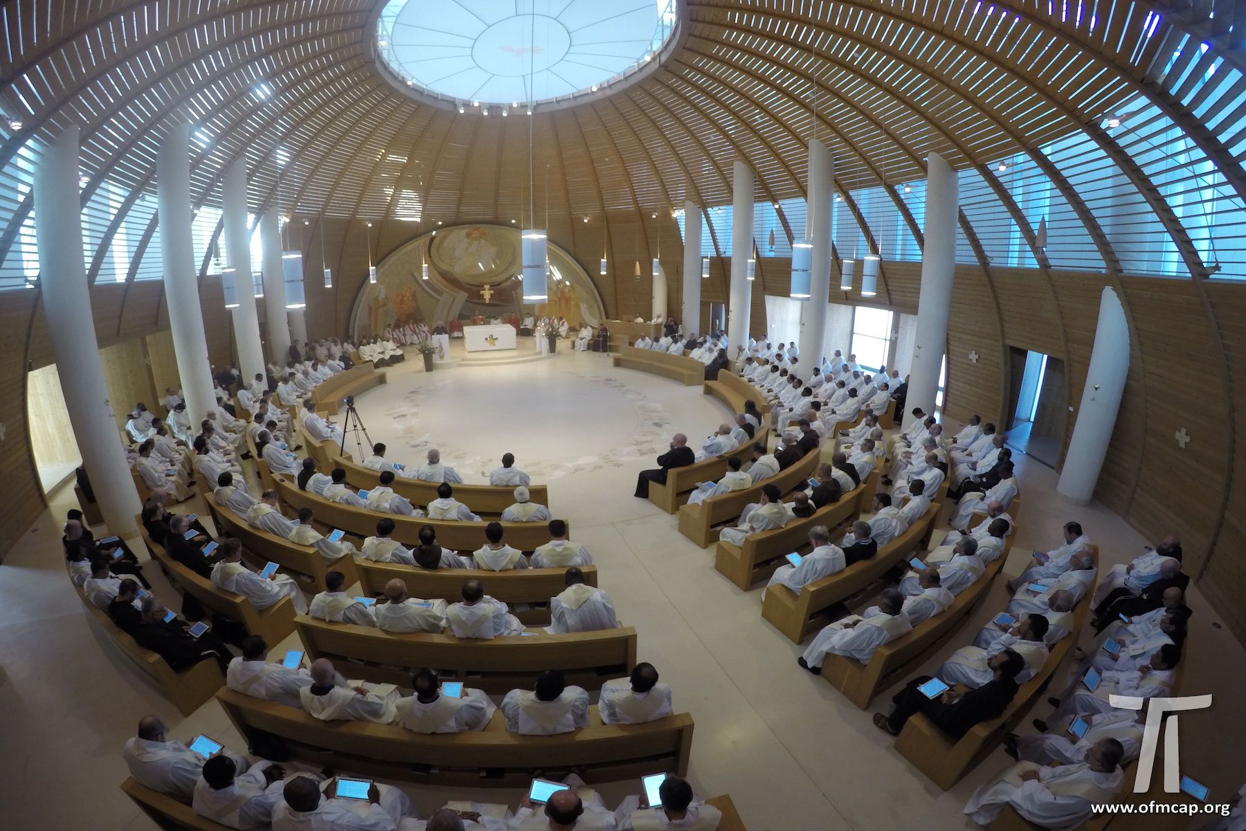 Roma (Collegio San Lorenzo da Brindisi), 27 agosto 2018. Finalmente il giorno del Capitolo è arrivato! I 188 Capitolari, in rappresentanza di tutte le circoscrizioni dell’Ordine, e i 48 ufficiali sono puntualmente arrivati e oggi, lunedì 27 agosto, alle ore 9.00, gremiscono la grande e bella Cappella del Collegio per la celebrazione dell’Eucaristia. Presiede la solenne Concelebrazione Fra Andrés Stanovnik, cappuccino, arcivescovo di Corrientes in Argentina. Nella sua Omelia, il Vescovo ha ricordato ai Capitolari “l’asse centrale intorno al quale dovrebbe muoversi il cuore dei frati” e cioè, come scrive San Francesco nella Regola non Bollata, “trattare delle cose che riguardano Dio”, vale a dire quelle cose che ispirano i fratelli a “vivere nel mondo la vita evangelica in verità, semplicità e letizia” (Cost. 147, 2). Mons. Stanovnik per spiegare meglio il suo pensiero cita San Bonaventura, che scrive così nel suo Itinerarium: “Dobbiamo abbandonare ogni speculazione di ordine intellettuale e concentrare in Dio tutte le nostre aspirazioni. Questo è qualcosa di misterioso e segreto, e lo può conoscere solo chi lo riceve, e non lo riceve se non chi lo desidera, e non lo desidera se non colui che è infiammato nel suo intimo dal fuoco dello Spirito Santo, che Cristo ha inviato sulla terra. Per questo, l’Apostolo dice che questa misteriosa saggezza è rivelata dallo Spirito Santo“. Ecco perché tutti noi siamo chiamati all’adorazione, alla contemplazione, alla preghiera.