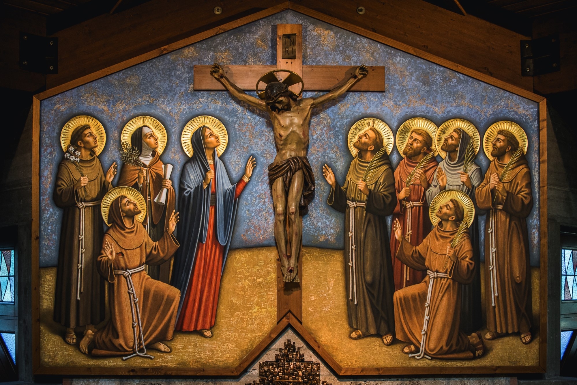 As fotos representam o quadro de Piero Casentini, Maria com os santos Antônio, Clara, Francisco e os Protomártires franciscanos em adoração do Crucifixo (2012), que se encontra no Mosteiro “Ss. Annunziata”, em Terni, Itália.