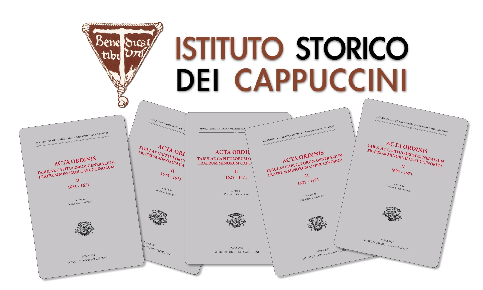 Acta Ordinis. Tabulae capitulorum generaleum Fratrum Minorum Capuccinorum, II: 1625-1671, edited by Vincenzo Criscuolo (Monumenta Historica Ordinis Minorum Capuccinorum, 42). Rome 2021, 24 cm., 607 p., Ill. ISBN 978-88-99702-22-9